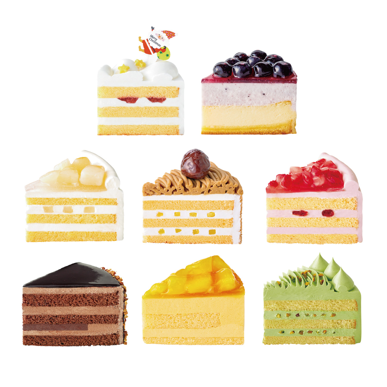 ホイップ・ブルーベリーチーズ・白桃・渋皮マロン・ストロベリー・チョコレート・マンゴー・ピスタチオの8種のアソートケーキです。