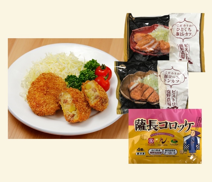 薩長コロッケ340g(85g×4個)、ロース豚カツ360g(120g×3枚)、一口ヒレカツ300g