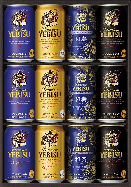 ヱビスビール缶350ml×3本、ヱビス クリエイティブブリュー和奏缶350ml×3本、ヱビス プレミアムエール缶350ml×3本、ヱビス プレミアムブラック缶350ml×3本