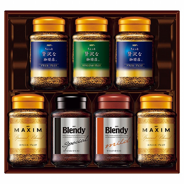 ちょっと贅沢な珈琲店インスタントコーヒー(ブラジルブレンド65g×2・キリマンジャロブレンド65g×1)、マキシムインスタントコーヒースペシャルブレンド65g×2、ブレンディインスタントコーヒー(スペシャルテイスト・マイルドテイスト各70g×1)