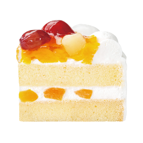 卵・乳製品・小麦粉を使用せず、国産米粉を使ったスポンジ生地で、黄桃と豆乳ホイップクリームをサンドし、自家製のいちごゼリー・ぶどう・洋梨・黄桃で仕上げたフルーツケーキです。