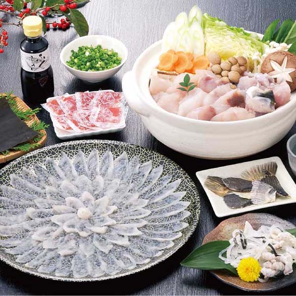 とらふく刺身80g(25cmプラ皿)(長崎県産等・養殖)、ふくちり400g(とらふくアラ150g(長崎県産等・養殖)、まふくちり250g(島根県産等))、とらふく皮刺50g、ひれ酒用とらふく焼ひれ3g、ぽん酢、もみじおろし、ねぎ、だし昆布