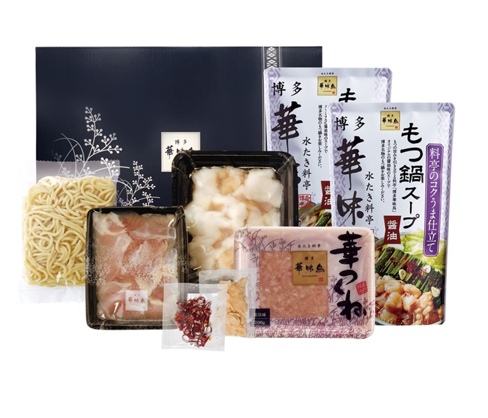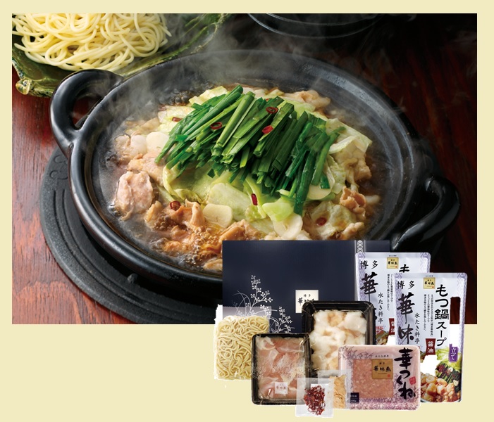 もつ鍋スープ600g×2、牛小腸200g×1、鶏はらみ100g×1、華つくね200g×1、ちゃんぽん麺150g×1、薬味セット×1
