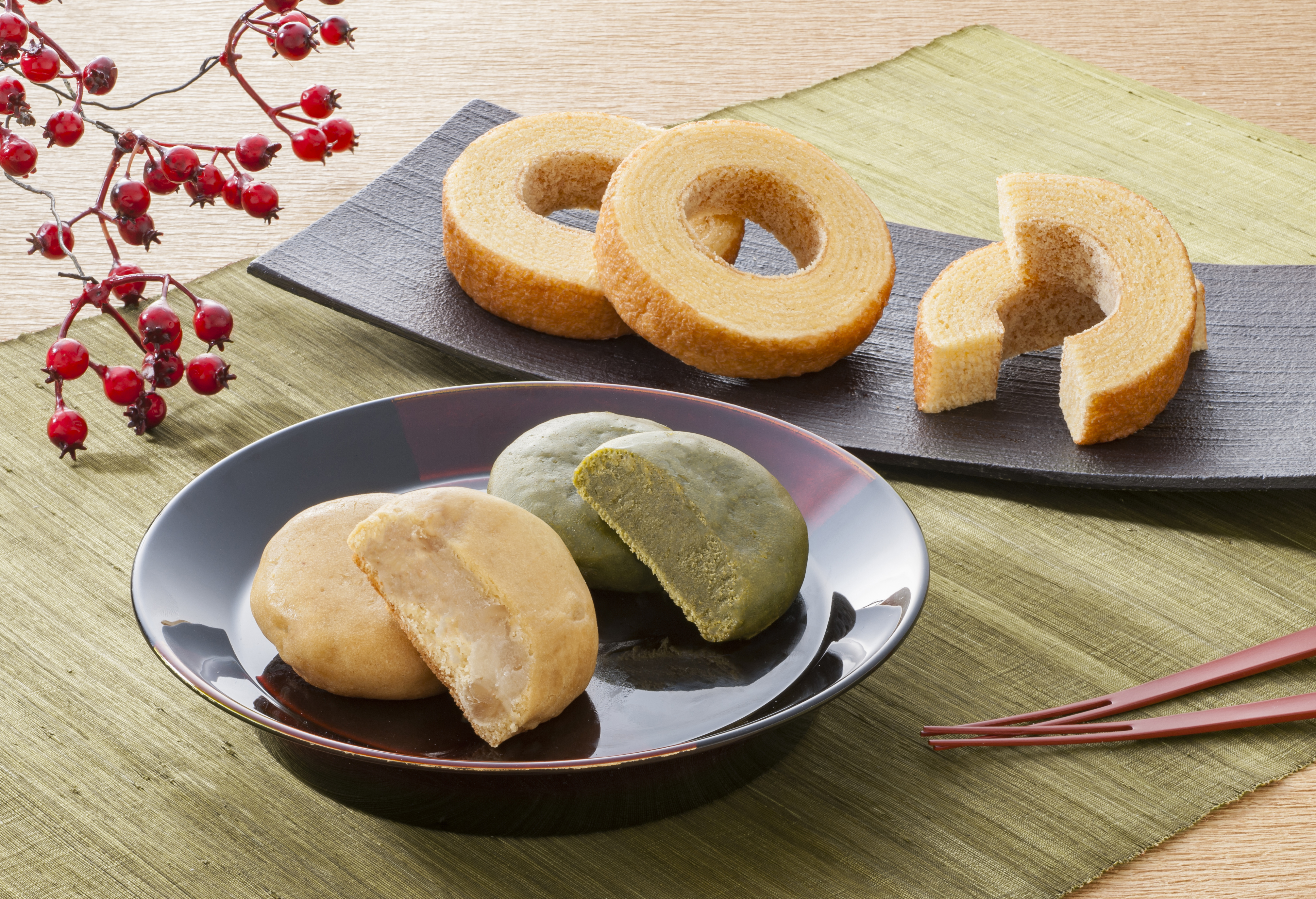 和三盆バウムクーヘン×4、ミルク饅頭(くるみ・抹茶)×各4(計12)