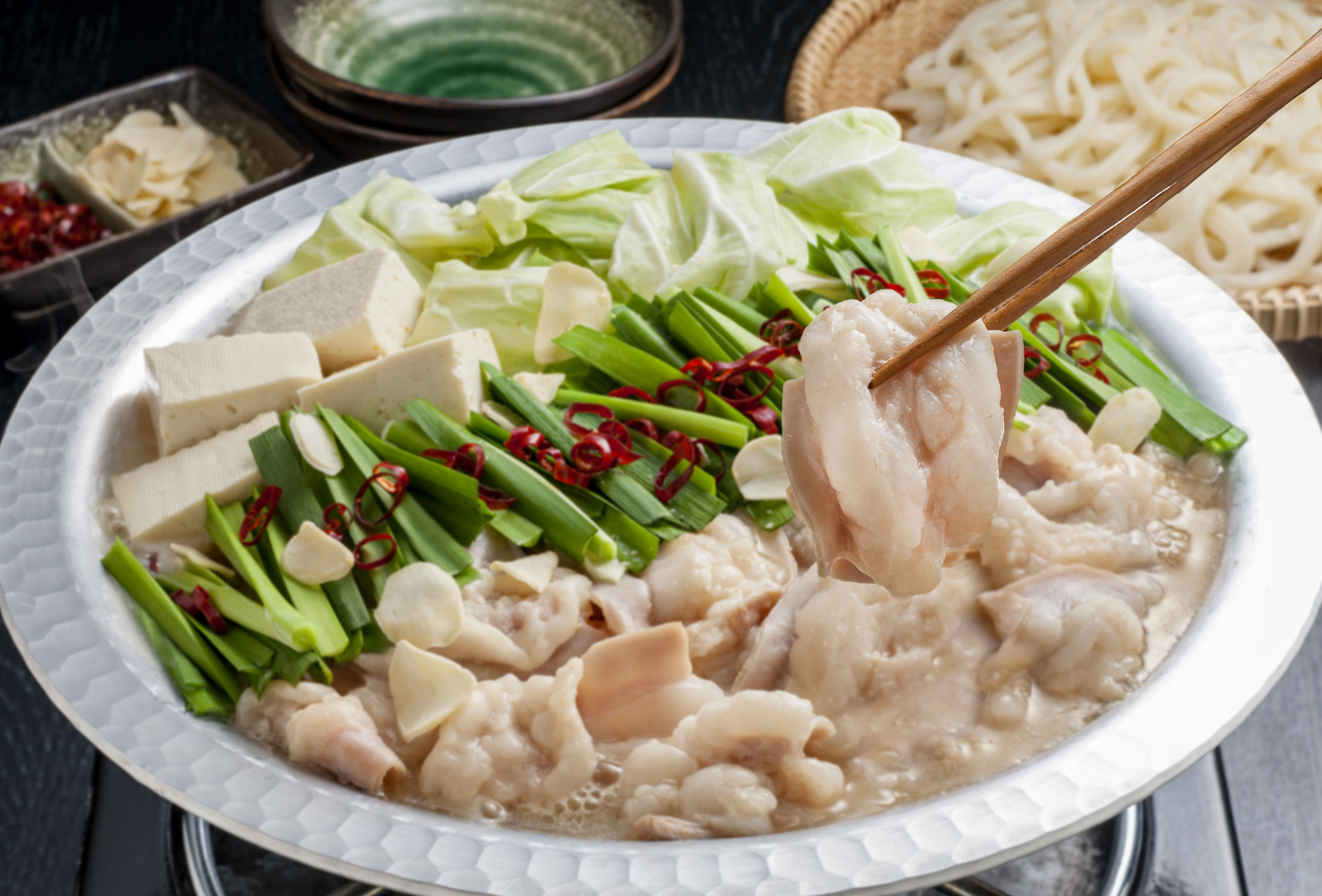 4人前(国産牛もつ約300g×1、白みそ濃縮スープ(5倍濃縮)160ml×1、うどん200g×2、にんにくチップ約5g×1、輪切り唐辛子約1g×1)