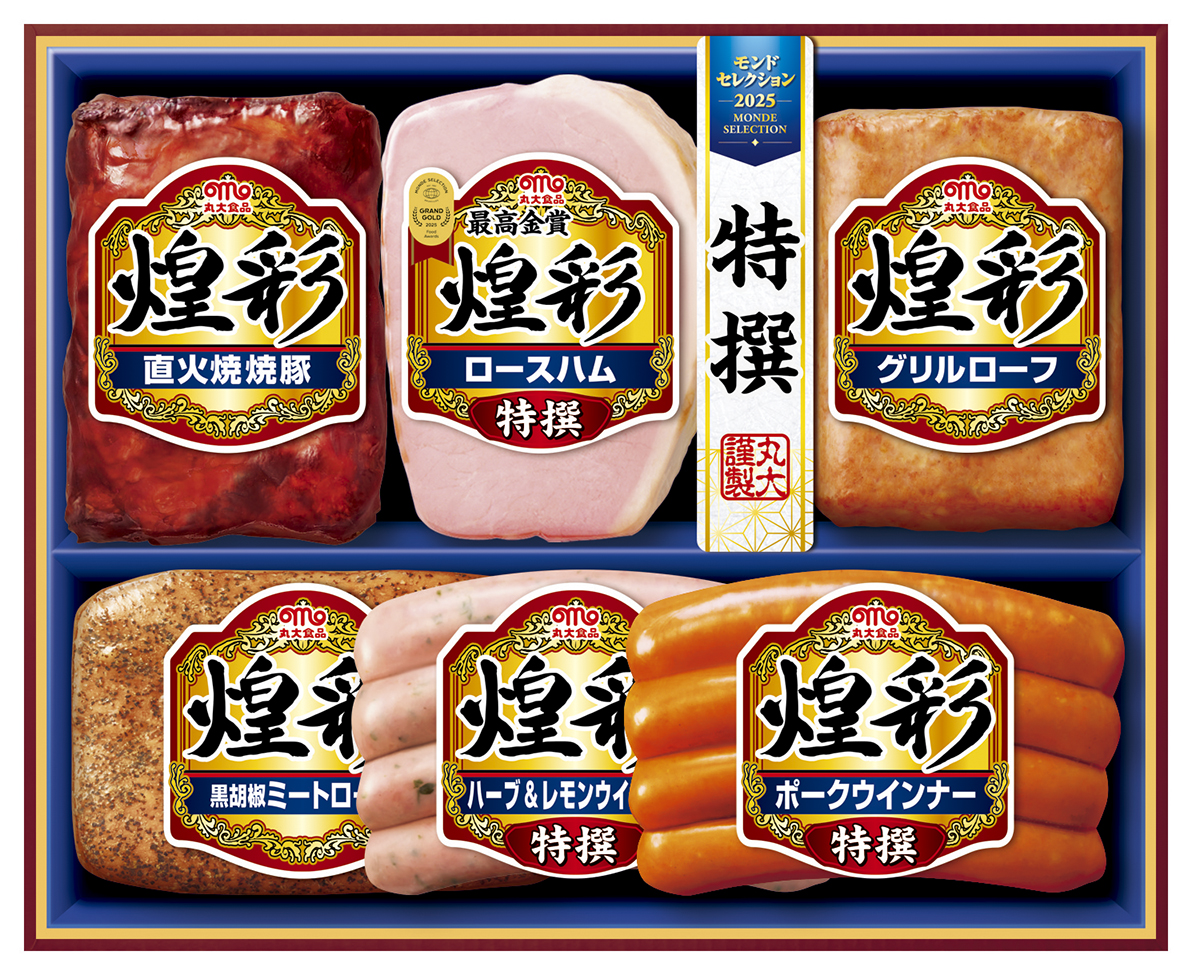 直火焼焼豚170g、特撰ロースハム 180g、黒胡椒ミートローフ 160g、グリルローフ110g、特撰ポークウインナー80g、特撰ポークウインナー(ハーブ&レモン)80g