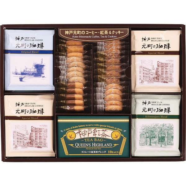 スペシャルブレンドコーヒー(ドリップ)7g×12、オリジナルブレンドコーヒー(ドリップ)7g×6、キリマンジャロブレンドコーヒー(ドリップ)7g×6、紅茶2g×10、ココナッツクッキー・紅茶クッキー・モザイククッキー・カフェキャラメルクッキー・チョコアーモンドクッキー・プレーンクッキー×各5