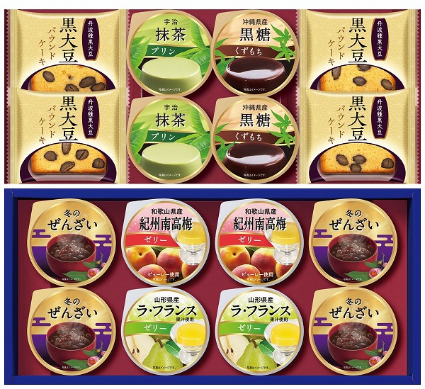 宇治抹茶プリン57g×2、沖縄県産黒糖くずもち57g×2、黒大豆パウンドケーキ×4、山形県産ラ・フランス果汁使用ゼリー62g×2、和歌山県産紀州南高梅ゼリー62g×2、冬のぜんざい50g×4