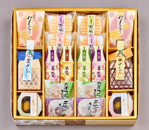 パイまんじゅう(小豆・さつまいも×各1)、欧風せんべい(バニラ×2、苺・抹茶×各1)、ようかん(小豆×2、抹茶・栗×各1)、寒天ぜんざい(小豆・栗×各1)、かすてらまんじゅう・栗まんじゅう・栗かのこ×各2
