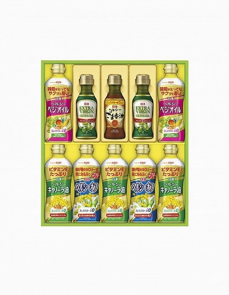 日清ヘルシーキャノーラ油350g×3、日清ヘルシーオフ・日清ヘルシーベジオイル 各350g×2、日清エキストラバージンオリーブオイル145g×2、日清ヘルシーごま香油145g×1