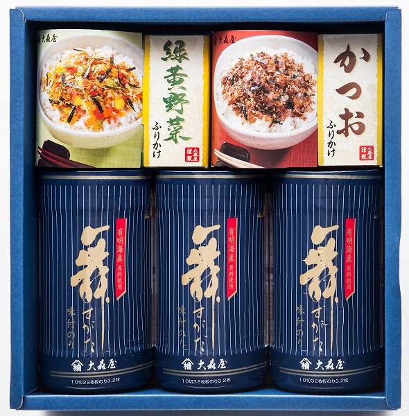 味付のり(10切32枚)×3、緑黄野菜ふりかけ・かつおふりかけ(2.5g×10袋)各1