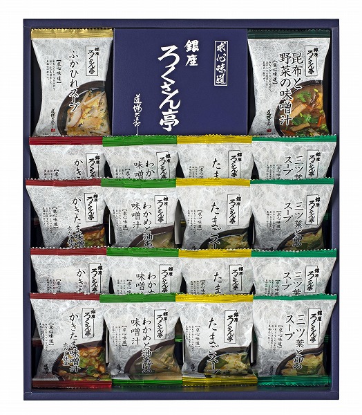 かきたま味噌汁赤だし仕立・わかめと油あげの味噌汁・たまごスープ・三ツ葉と卵のスープ×各4、ふかひれスープ・昆布と野菜の味噌汁×各1