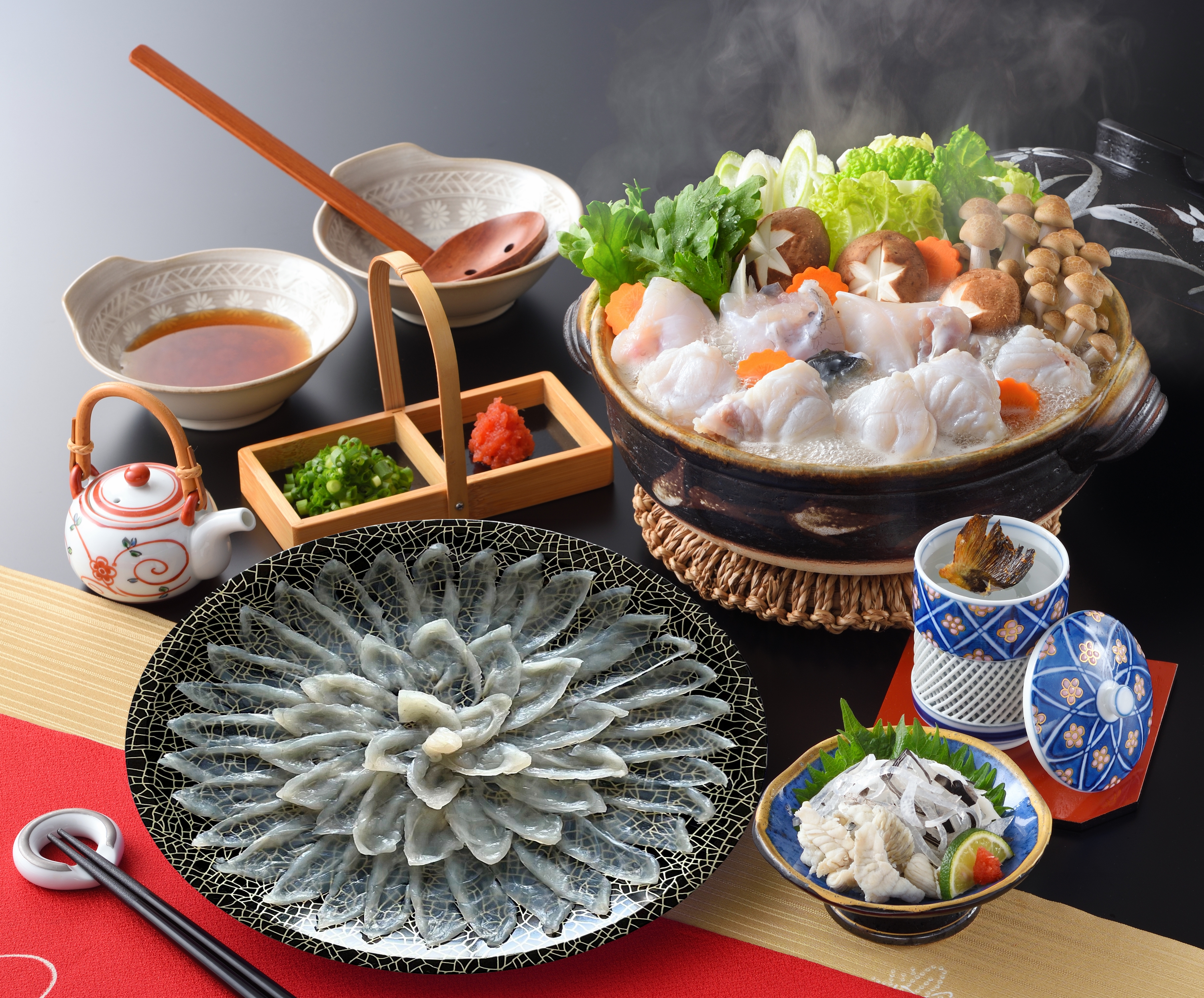 プラ皿28cm、とらふぐ刺身130g、とらふぐ皮80g、マフグちり200g(国産近海物)、ポン酢150ml瓶*1、もみじおろし5g*5、とらふぐひれ5枚