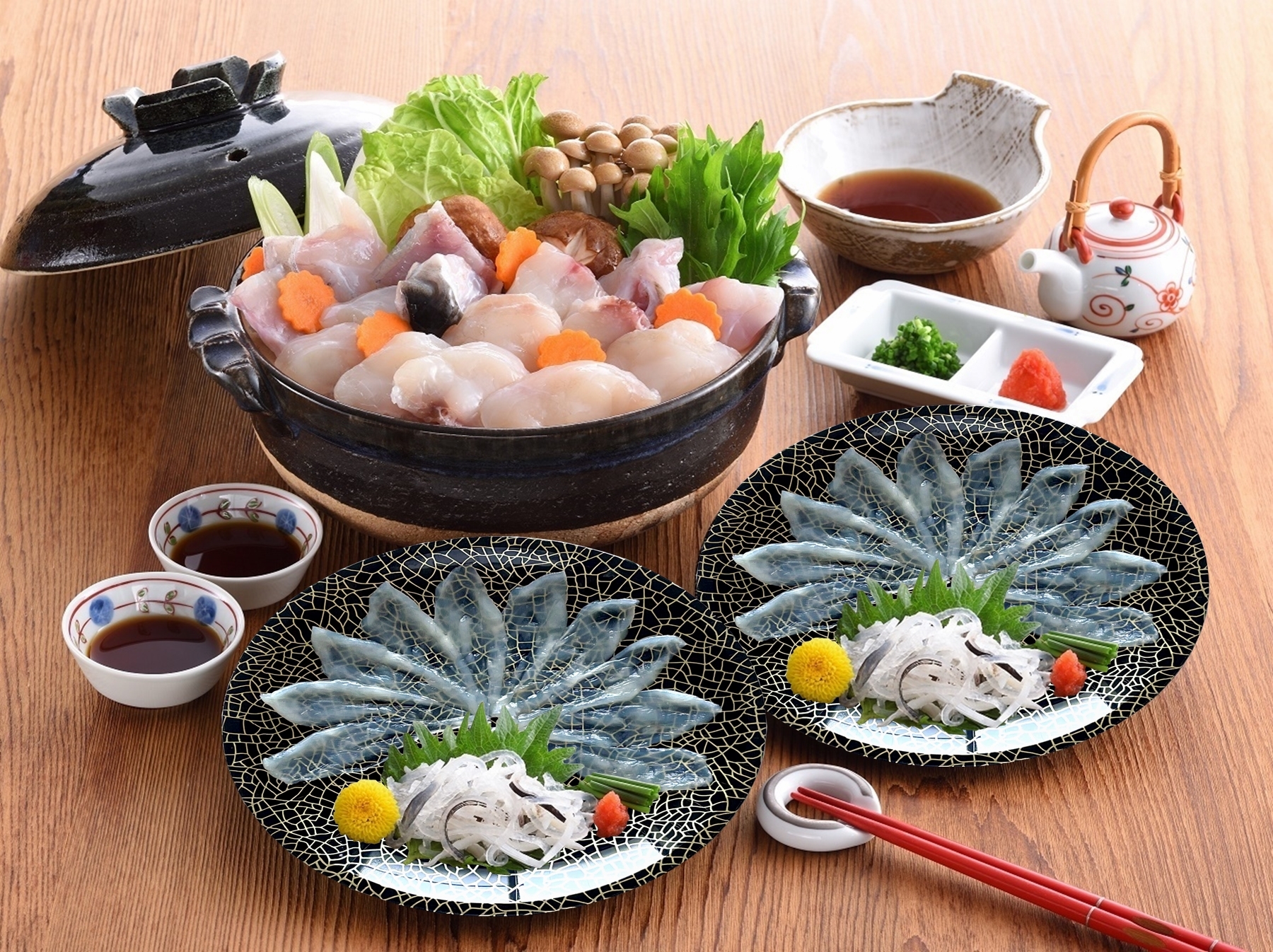 D-FPとらふぐ刺身(19cmプラ皿)15g×2、とらふぐ皮刺15g×2、ポン酢14g×2、もみじおろし2.5g×2、ふぐちり(とらふぐアラ80g・真ふぐちり170g)250g、ポン酢15g×2、もみじおろし3g×2